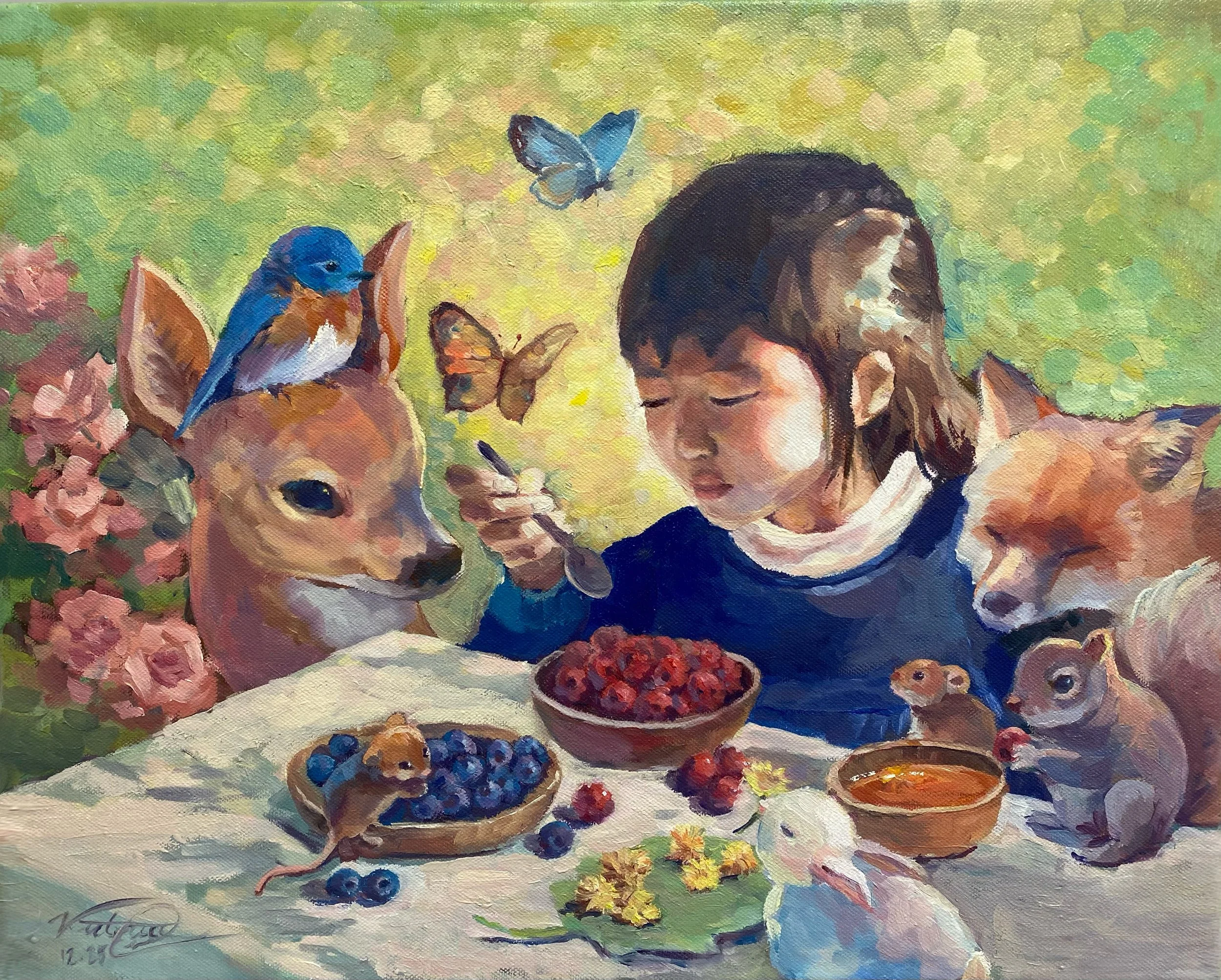 I paint myself as a child to represent purity and innocence, as the age when animals are most loved. We gather in a lush forest, sharing a meal which represents mutual vulnerability and trust. Depicting these elements is my way of suggesting a world in which humans and nature can coexist without fear, dominance or hierarchy. Where even after maturing, man continue to treat animals the same.