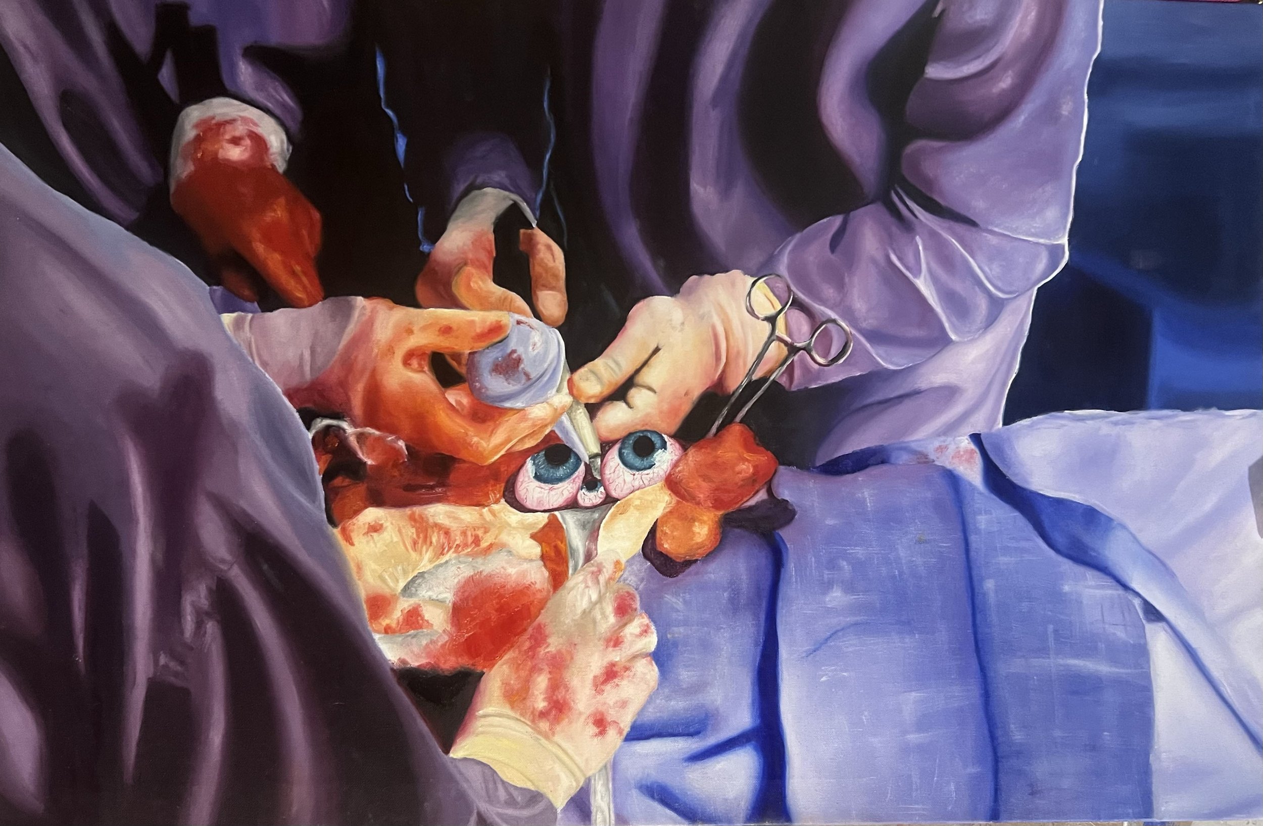 This piece is meant to illustrate the effects anxiety has when clouding my judgement from a surgical perspective. Whether it’s more invasive like a heart surgery, or something being done on simpler body parts, everyone becomes anxious. This is primarily due to people fearing what they don’t understand. This piece is meant to show how even with the understanding that the surgeon has years of education, practice, and precision, I still felt uneasy being operated on. Despite understanding such, I was growing increasingly more anxious with the thought of something going wrong. One small tear could leave me paralyzed. All those negative thoughts clouded my mind as I prepared for the operation. The eyes in the area where they are operating is meant to symbolize how I felt when in the surgical room, constantly wanted to see every more or decision the doctors made.