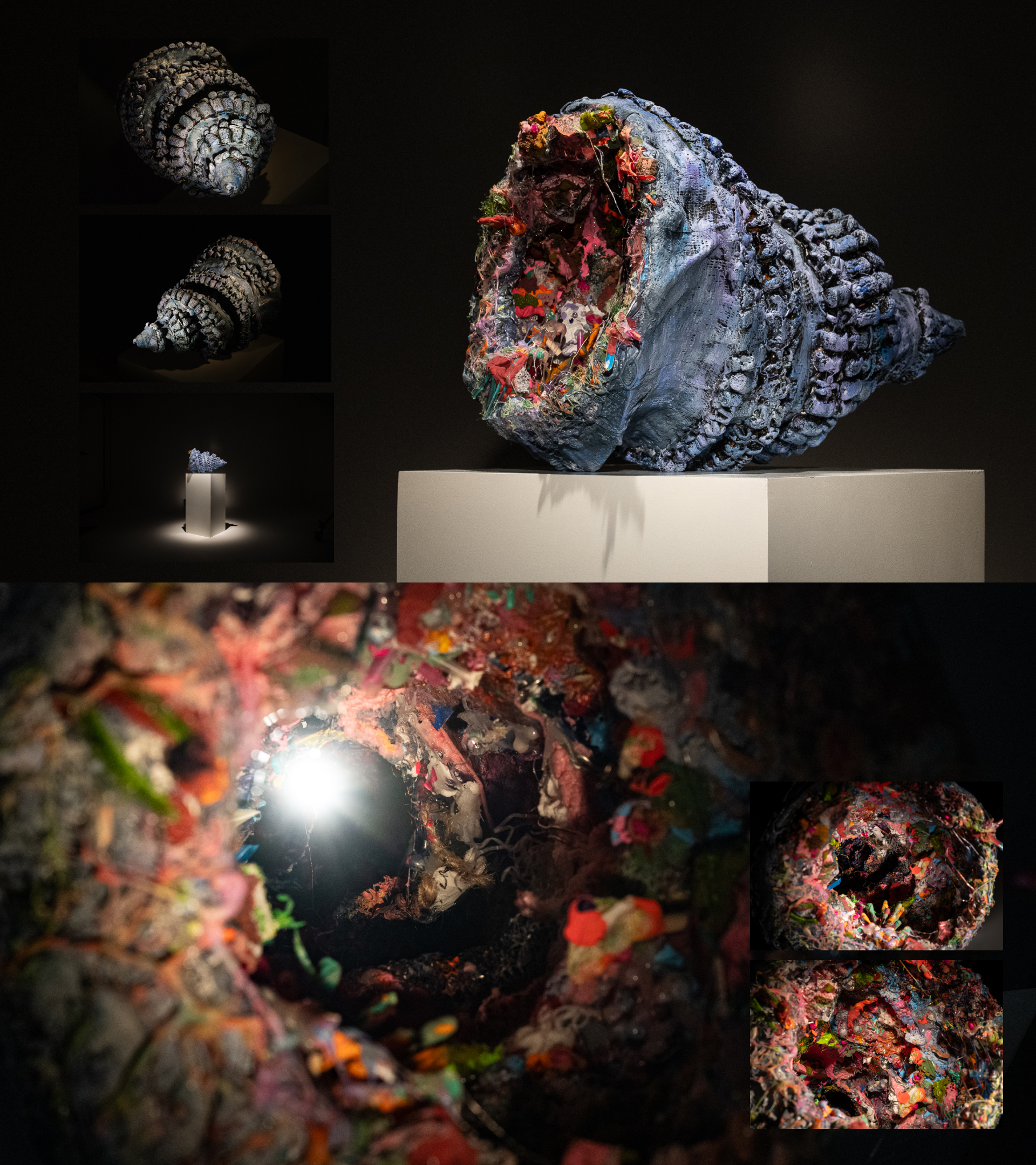 This work embodies my life in turmoil when I couldn't find what I truly wanted. The 3D form is the visual representation of what I have envisioned a space to look like. This chaotic and unorganized space symbolizes the feelings I felt when I lost my purpose in life and clung to the most unimportant things. I felt like I was spiraling into darkness, but the rays that seep through symbolize hope, and this is the core message of this piece. I tried to draw a connection between the chaos Jonah experienced inside the belly of the big fish in the Bible and my inner turmoil.